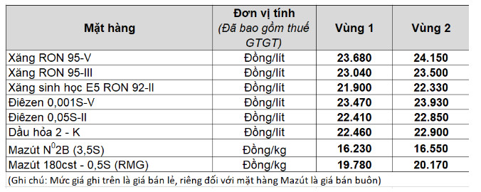 Mức giá mới có hiệu lực từ thời điểm 16 giờ 00 ngày 11 tháng 10 năm 2023 cho đến khi có thông cáo báo chí (TCBC) mới.